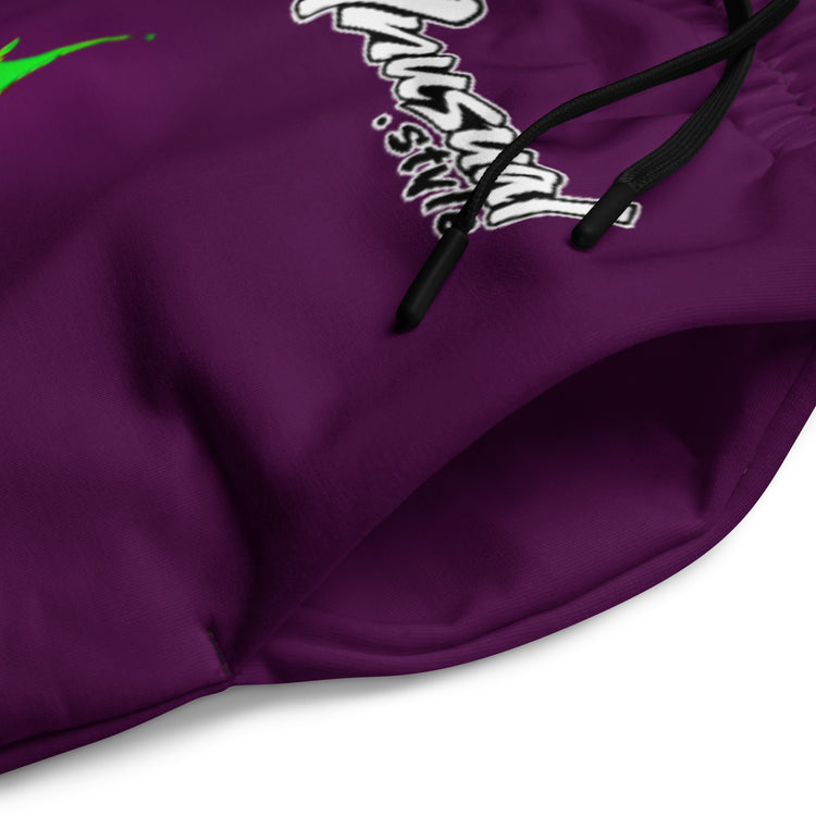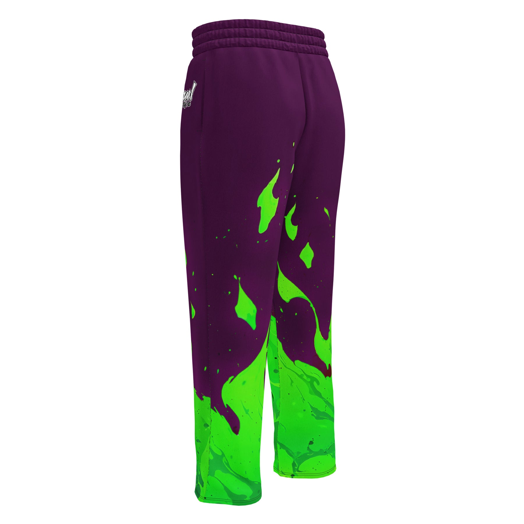 Purple fabric drowned in green fire — flames laced with venom, burning wrong, burning loud. A corrupted blaze that glows like poison in the dark. Wide-leg cut built for movement, with the bite of streetwear made dangerous.